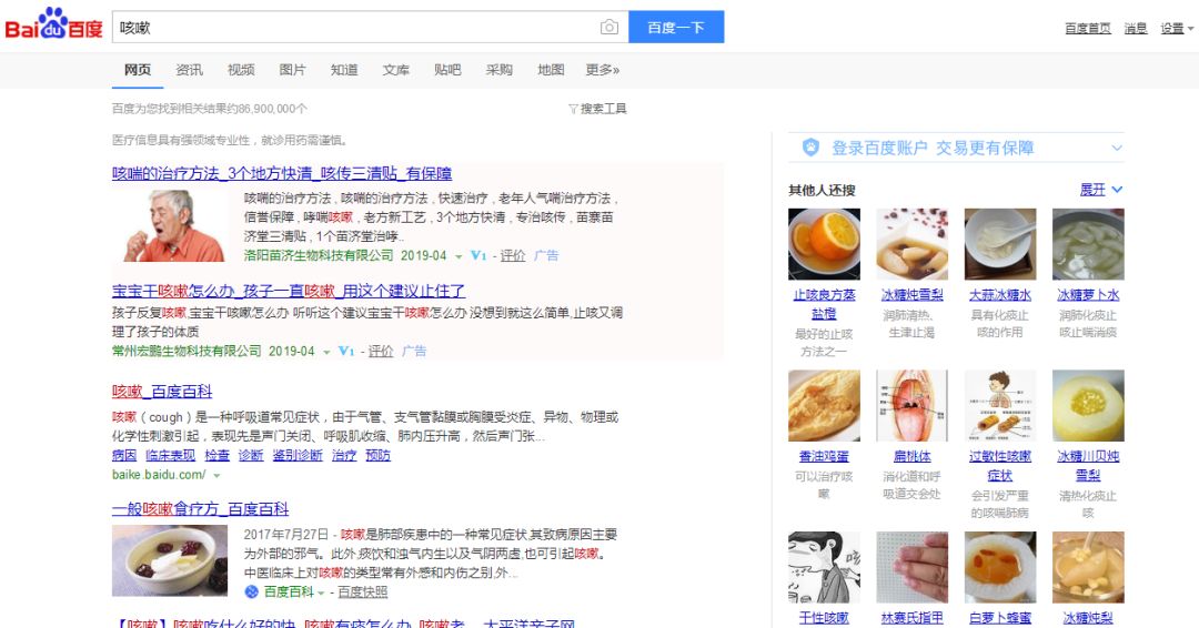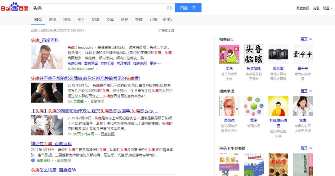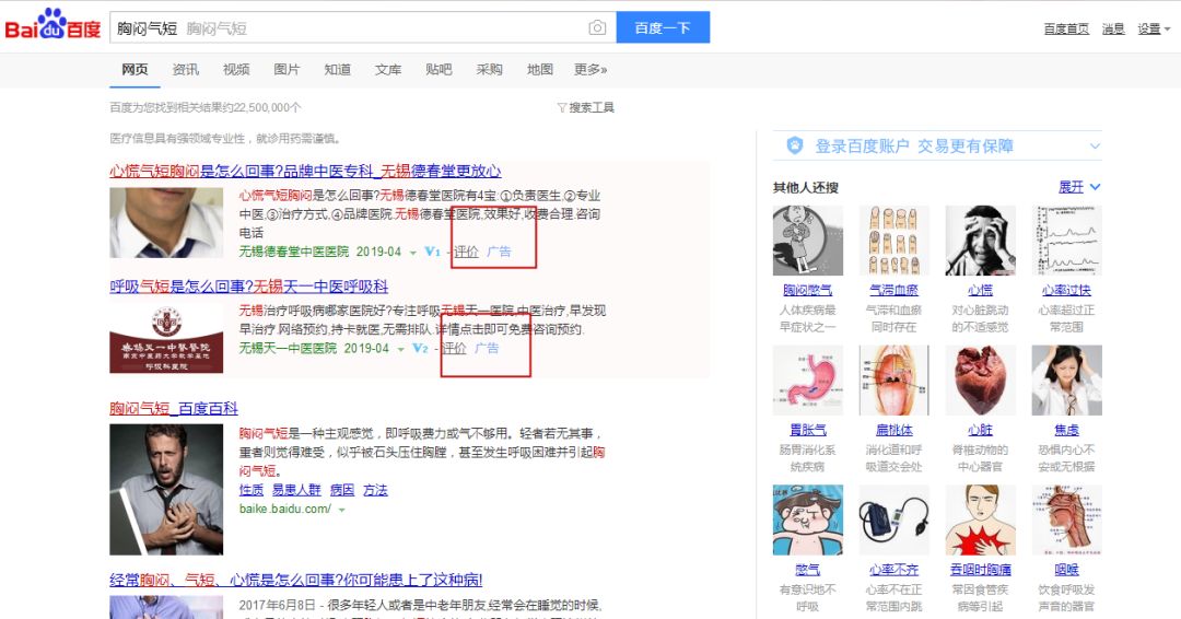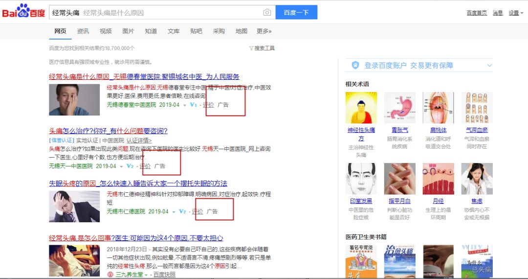 搜索“头痛”、“心脏病”字段,会发现首页并无广告,但是更改为“经常头痛”、“胸闷”描述为症状,便出现了本地医院的广告。