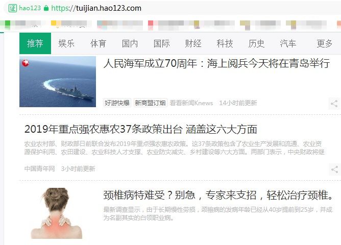 点击后,打开的并不是其他新闻的门户网站,是域名为hao123的网站,然后向下滚动,就会看到推荐页面里充斥着各种广告: